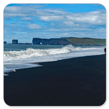 Der Strand ist wirklich schwarz. Auf der anderen Seite blickt man auf das Kap Dyrholaey mit dem Felsentor. Die 120 m hohe "Türhügelinsel" ist bei einem früheren Vulkanausbruch entstanden. Heute ist die Insel verlandet und zu einem Kap geworden. Durch das Felsentor kann man mit einem Boot hindurchfahren.