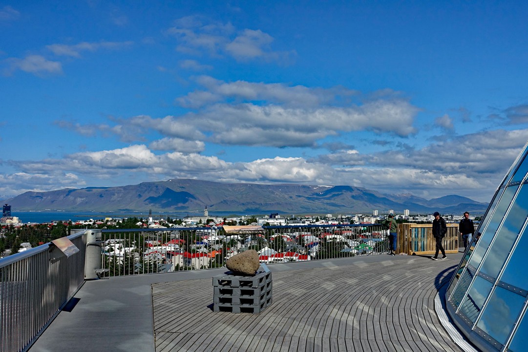 Das Angebot nehmen wir gerne an und erhoffen uns einige schöne Ausblicke von der Glaskuppel. Das 25 m hohe Gebäude besteht aus 6 Warmwassertanks, die aus verschiedenen Bohrlöchern mit 85°C heißem Wasser gespeist werden und zur Versorgung von Reykjavik mit heißem Wasser dienen. Auf diese Wassertanks wurde eine Glaskuppel gesetzt, in deren oberster Etage sich ein Drehrestaurant befindet. Das ist zwar ziemlich teuer, aber so hat man abends und in der Nacht natürlich einen fantastischen Blick auf den Himmel und während der Wintermonate auf die Polarlichter.Im Gegensatz zu unserem letzten Besuch ist heute schönes Wetter und nach einem Cappuccino mit einem Stück Kuchen ( - über die Kosten von 30 Euro schauen wir großzügig hinweg - ) betrachten wir die Stadt Reykjavik von der Aussichtsplattform aus: