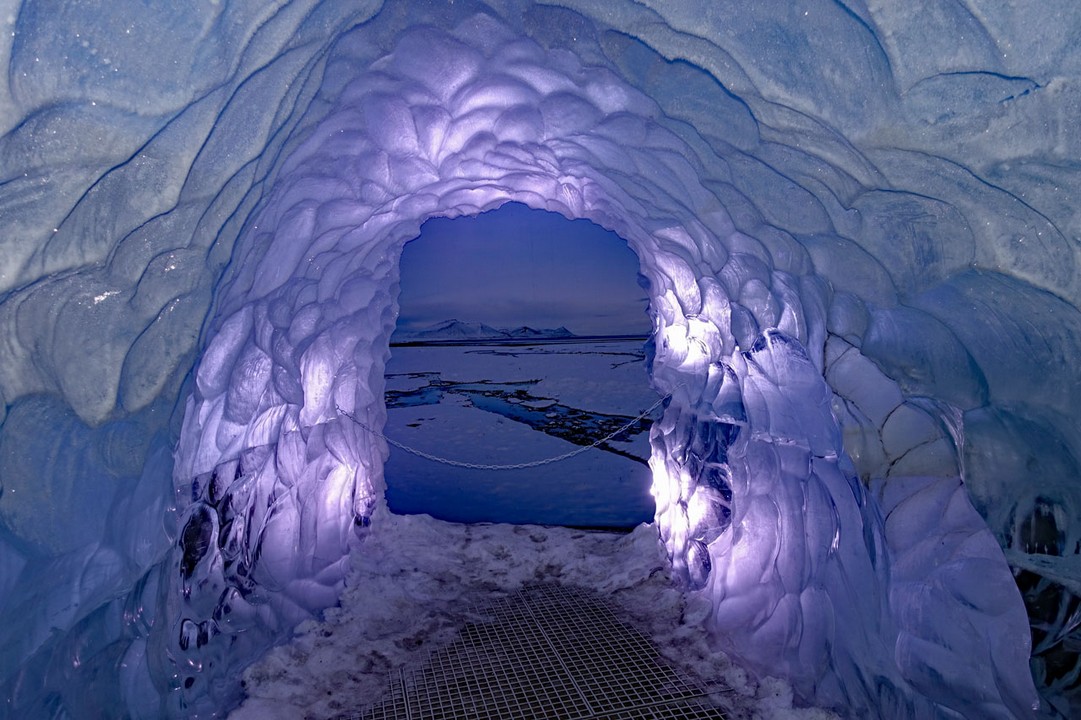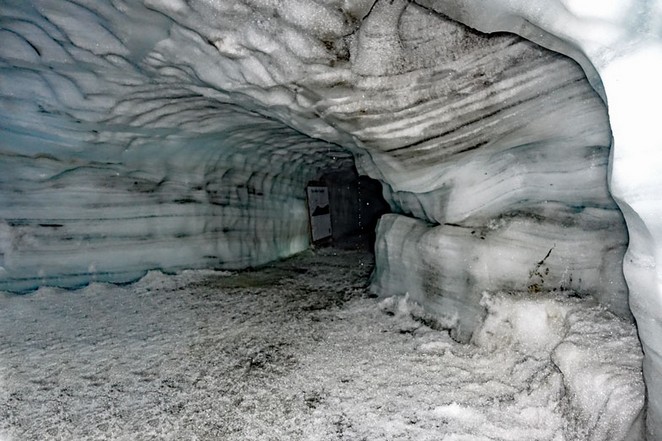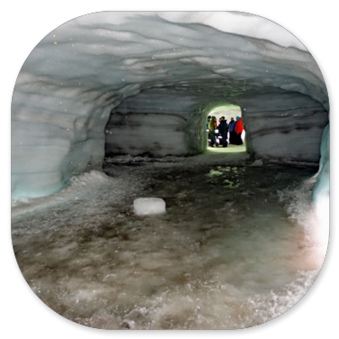 Das Gletschermobil bewältigt die Strecke vom Basislager, das in 800 m Höhe liegt, bis zum Eingang des Tunnels in 1400 m in etwas mehr als 20 Minuten. Die Firma hat zu Forschungszwecken (und natürlich als Touristenattraktion) einen 550 m langen Tunnel in die Eisschicht gebohrt, der bis in eine Tiefe von 40 m führt. Während draußen jetzt hier oben eine Temperatur von etwa 5° C herrscht, ist es im Tunnel ganzjährig um die 0°Celsius.