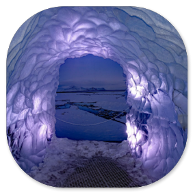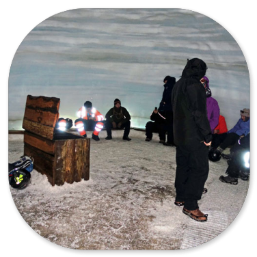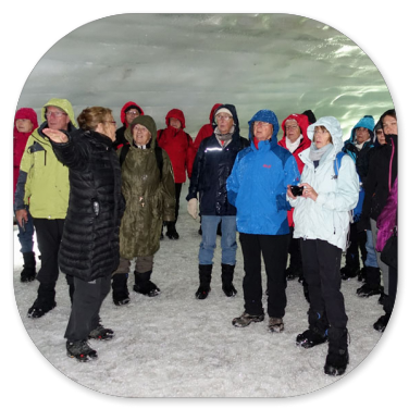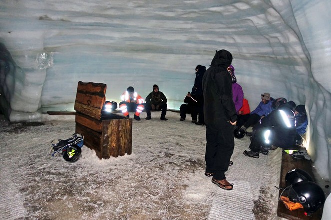 Dadurch haben sie die fünffache Auflagefläche und können sich relativ sicher auf dem Gletschereis fortbewegen. Wenn kein Eis vorhanden ist und die Strecke über Lavabrocken oder Geröll führt, wird einfach während der Fahrt der Luftdruck erhöht und man hat wieder ein Geländefahrzeug. Im Basiscamp können wir uns etwas aufwärmen, weil wir auch noch warten müssen, denn eine andere Gruppe ist noch vor uns an der Reihe. Wir können uns jeweils passende wasserdichte Überziehschuhe aussuchen, weil jetzt während der Sommerzeit viel Schmelzwasser im Gletscher entsteht und die Gänge ziemlich nass sind.