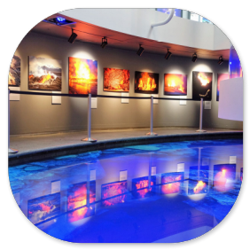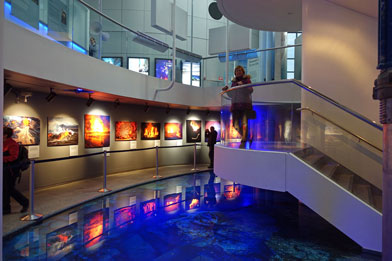 Das Gebäude ist schon beeindruckend, wenn man im Innern die Treppen hinauf- oder hinuntersteigt oder die einzelnen Konzertsäle sieht. Wir spazieren durch das Gebäude und steigen an vielen unterschiedlichen Treppenaufgängen hinauf oder hinunter. Die Wirkung des Lichts hinter den Glasbausteinen ist überall anders und man muss sich einfach die Zeit nehmen, dies zu bewundern. Natürlich ist alles ziemlich touristisch aufgemacht und neben den Blumenläden und Cafés gibt es viele Geschäfte mit Souvenirs. Die sind allerdings sehr schön und gut ausgewählt. Viele Touristen sind begeistert von der isländischen Kunstkultur und kaufen entsprechend ein. Zu bestimmten Zeiten kann man an einer Führung teilnehmen, aber wir verzichten darauf und buchen zwei Tickets für einen Film im Keller über die Wunderwelt Islands. Der ist leider ziemlich enttäuschend, denn die Projektion auf alle vier Wände des Kinos ist einerseits schwierig anzuschauen und andererseits ist die Beleuchtung zu schwach, um wirklich die Farben leuchtend darzustellen. Schade.