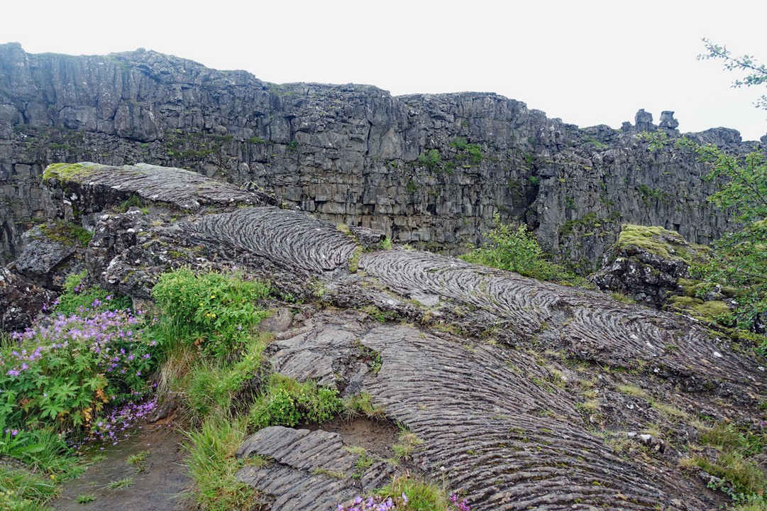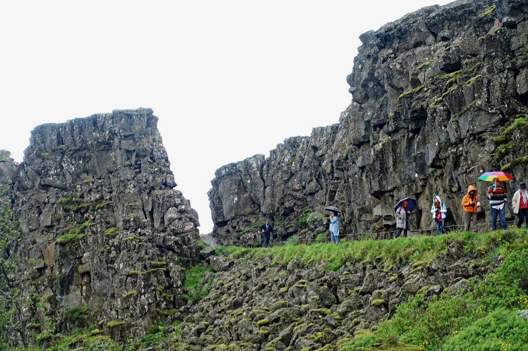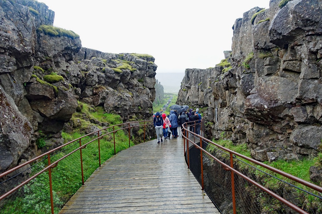 Wie auf dem oberen Bild zu sehen ist, zieht ein großer Bruchgraben durch dieses Gebiet. Durch den ziehen an diesem Tag mehrere Tausend Touristen, wie auf dem Bild zu sehen ist. Das hängt auch damit zusammen, dass gerade ein Kreuzfahrtschiff im Hafen liegt und die meisten Passagiere den "Golden Circle" als Ausflugsprogramm buchen, weil der ja die drei Highlights der Insel umfasst. Und schließlich ist der Thingvellir-See mit der Schlucht das erste Highlight.