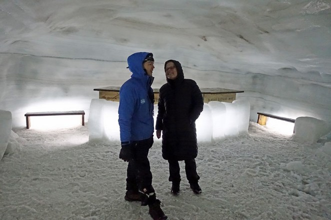 1 1/2 Stunden spazieren wir in verschiedenen Gängen und Tiefen durch den Gletscher. Es ist kalt und nass. Manchmal hört man kein Echo, weil viel Luft in der Harsch-Schicht enthalten ist. An anderen Stellen ist das Eis dicht und ohne eingeschlossene Luftblasen. Dann hallt unsere Stimme dort deutlich. Zum Schluss sind wir froh, dass wir wieder ans Tageslicht kommen, weil wir ganz schön durchgefroren sind.
