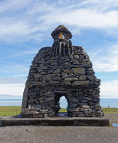 Hier steht auch eine Skulptur aus aufgeschichteten Steinen, die 1985 von dem Bildhauer Ragnar Kjrtansson zu Ehren von Bardur errichtet worden ist.Der Sage nach war Bardur einer der ersten Siedler hier in der Gegend um den Snaefellsjökull. Er ar aber größer und stärker als alle anderen, weil er Trollblut in seinen Adern hatte und die Zaubergabe hatte. Er neigte aber auch zu Berserkertaten und tötete seine Neffen, weil die nicht auf seine Tochter aufgepasst hatten. Schließlich verschwand er aber nach einem Kampf mit seinem Halbbruder im Snaefellsjökull und ward nie mehr gesehen. Die Isländer glauben, dass er noch heute dort lebt und verehren ihn als Schutzgeist.