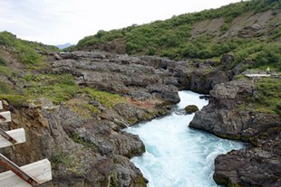 Der Barnafoss Wasserfall ist ein Wasserfall mit einer Länge von über einem Kilometer. Unzählige kleine und größere sprudelnde Quellen treten aus dem Berg hervor, der mit Büschen und Bäumen bewachsen ist. Eigentlich sind das keine Wasserfälle, wie man sich die normalerweise vorstellt. Vielmehr versickert der Fluss Hvíta etwas weiter oberhalb in einem ziemlich porösen Lavafeld, wird dann durch die verschiedenen Gesteinsschichten gefiltert und tritt anschließend als sauber geklärtes Wasser weiter unterhalb wieder aus dem Lavagestein auf einer Länge von mehr als 700 Metern aus. Das Wasser ist durch diesen Prozess so geklärt, dass es wunderbar blau aus dem Berg herauskommt.