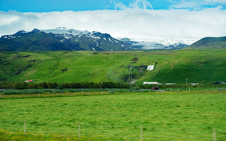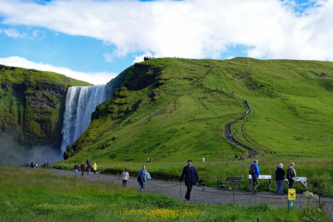 Schon um 8:00 Uhr starten wir zur Südküste mit 25 Personen in einem sehr bequemen Reisebus. Wir scheinen Glück mit dem Wetter zu haben, denn es sind einige Sonnenstrahlen zu sehen, während die Temperatur noch bei 10 °C liegt. Reiseführerin Angelika erzählt sehr anschaulich etwas aus der Geschichte der ersten Besiedlung Islands. Und natürlich die blutige Saga von Njals und dem schönen Gunnar mit seiner rachsüchtigen Ehefrau. Die isländischen Sagen sind auch heute noch Stoff für Romane, Theaterstücke oder Filme. Es gibt sie auch als deutsche Übersetzung im Internet.Die Fahrt an der Südküste entlang über die Landstraße Nr. 1 geht durch grüne Wiesen, auf denen Schafe und Pferde weiden. Im Hintergrund ist der Eyjafjallajökull zu sehen, der bei seinem Ausbruch 2010 die gesamte Umgebung mit einem Ascheregen überzogen hat. Damals ist sogar der gesamte Luftverkehr über Europa davon betroffen gewesen. Angelika erzählt aus eigener Anschauung, was um den Berg herum los gewesen ist.