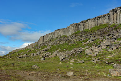 Hier machen wir unseren ersten Fotostopp an den Basaltfelsen der Gerduberg-Cliffs.Solche Basaltstrukturen sind typisch für die erkaltende Lava nach Vulkanausbrüchen und sind auch die grundlegende Idee für die Hallgrimskirche in Reykjavik gewesen. Uns interessiert das gar nicht so sehr, denn vielmehr freuen wir uns über den blauen Himmel dahinter und dass es nicht regnet.