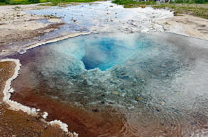 Kurz nach 14:00 Uhr geht es weiter zum dritten Höhepunkt des Golden Circle, nämlich zum Ort Geysir. Das geothermische Gebiet ist etwa 3 km² groß und hat mehrere kleine Springquellen. Wir hatten ursprünglich angenommen, dass es hier in Island vor Geysiren nur so wimmelt, wo doch der Begriff "Geysir" von hier kommt. Aber das ist gar nicht der Fall, denn im Augenblick spuckt nur der Strokkur Geysir unregelmäßig alle 3 - 10 Minuten seinen heißen Dampf aus. Auf meinem kleinen Videoausschnitt können Sie das miterleben. Der eigentliche Geysir, nach das Gebiet hier benannt wurde, hat noch im 19. Jahrhundert manchmal eine 70 m hohe Fontäne herausgeblasen, ist aber dann immer mehr versiegt. Die umliegenden Springquellen und Fumarole dampfen zwar, aber sind nicht so farbenfroh wie in Neuseeland oder im Yellowstone Park in den USA.