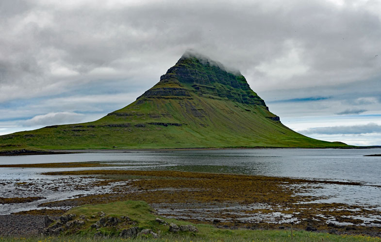 Ein paar Kilometer weiter, als wir die Halbinsel in nördlicher Richtung durchqueren, ist es leider schon wieder vorbei mit dem schönen blauen Himmel und alles wird grau. So ist das auch bei unserem nächsten Fotostopp am berühmten Kirkjufells, dessen Spitze wir nur in den Wolken vermuten können.