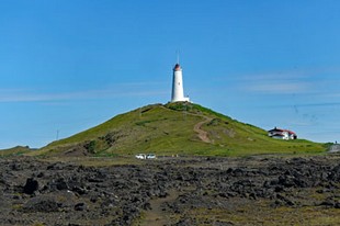 Die Landschaft hier ist karg; nur Moose und Flechten haben sich auf der Lava angesiedelt, denn durch die starken Winde und Stürme gedeiht hier sonst nichts. Hinter dem Leuchtturm ist eine pechschwarze Steilküste aus Lavabrocken und einem Denkmal für den letzten Alk. Dieser riesige Vogel war 5-6 kg schwer und sein Fleisch wohlschmeckend. Deshalb wurde er natürlich von den nordischen Völkern schon seit dem Mittelalter gejagt, was besonders leicht fiel, weil der nämlich wegen seiner fehlenden Flügel nicht fliegen konnte. Nachdem er schon in Kanada und Grönland ausgerottet war, wurden 1844 die letzten beiden Exemplare auf der Insel Eldey geschossen. Die Insel sieht man auf dem Foto weit draußen auf dem Meer. Zu Ehren des Vogels wurde eine Skulptur errichtet.