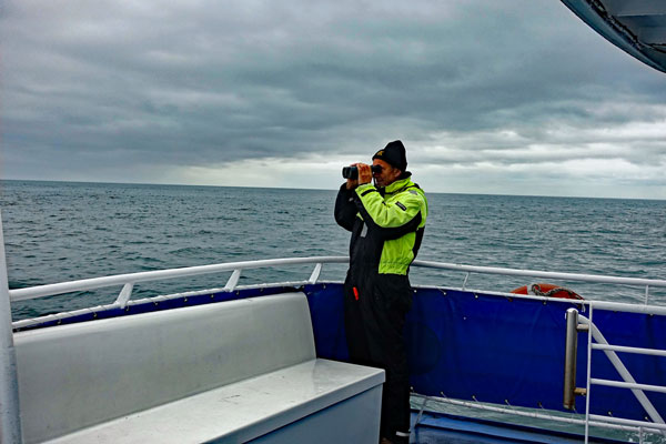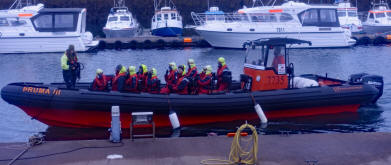 Auf der anderen Hafenseite startet ein Schlauchboot mit Touristen, die wie Feuerwehrleute verkleidet wurden. Wahrscheinlich wissen die Insassen nicht, dass die Wellen des Nordatlantiks kräftig zuschlagen, wenn sich das Boot mit hoher Geschwindigkeit den Walen nähert. Wahrscheinlich wissen sie auch nicht, dass sie alle pitschnass dabei werden. Wir sind jedenfalls froh, dass wir nicht die nächsten 3 Stunden so hintereinander eingepfercht sitzen müssen, sondern auf der "Andrea" ein bisschen mehr Bewegungsfreiheit genießen.Sehr positiv finden wir, dass wir auf dem Schiff in die bereitgestellten und wasserdichten Overalls schlüpfen können, die ganz hilfreich bei der Walbeobachtung auf dem Oberdeck sind, denn der Wind ist kühl und kräftig, obwohl das Meer ruhig und der Wellengang nicht sehr hoch ist. Unsere dreistündige Tour mit dem Walbeobachtungsboot ist sehr informativ, weil die begleitende Meeresbiologin Annika alles sehr sachkundig in englisch und deutsch erklärt. Nach langer Suche entdecken wir tatsächlich einige Zwergwale, die Lust haben, mal ab und zu aufzutauchen. Leider verschwinden sie so schnell, dass man nur die Rückenflosse zu sehen bekommt. Mir gelingen gerade mal 4 Fotos, auf denen etwas von einem Wal zu sehen ist. Auf der Rückfahrt erklärt Annika noch einige Walknochen, die man anfassen oder mit denen man sich fotografieren lassen kann.