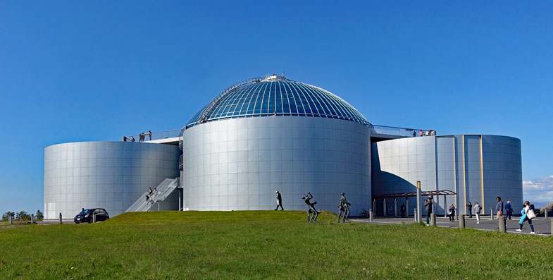 Das Angebot nehmen wir gerne an und erhoffen uns einige schöne Ausblicke von der Glaskuppel. Das 25 m hohe Gebäude besteht aus 6 Warmwassertanks, die aus verschiedenen Bohrlöchern mit 85°C heißem Wasser gespeist werden und zur Versorgung von Reykjavik mit heißem Wasser dienen. Auf diese Wassertanks wurde eine Glaskuppel gesetzt, in deren oberster Etage sich ein Drehrestaurant befindet. Das ist zwar ziemlich teuer, aber so hat man abends und in der Nacht natürlich einen fantastischen Blick auf den Himmel und während der Wintermonate auf die Polarlichter.