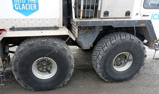 Man hat die LKWs für die Gletscher umgebaut, indem man ihnen nicht nur größere Reifen verpasst hat, sondern man kann vom Führerhaus aus die Luft aus den Reifen ablassen.