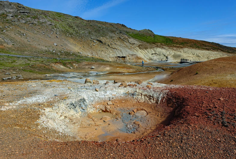 Anschließend spazieren wir durch die bunte Landschaft mit den Solfataren bei Seltun. In diesem Hochtemperaturfeld übersteigt die Temperatur in 1000 m Tiefe die 200°C Marke. Überall brodelt es und riecht nach Schwefel. Der Rundweg um die Schlammlöcher und Fumarole geht teilweise über rutschige Lava, was mir gar nicht gefällt, denn auf einem steilen Abhang rutsche ich aus und das bekommt meiner Camera gar nicht, denn jetzt geht die Blende nicht mehr zu..