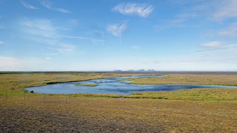 dass die Asche als Dünger gewirkt hatte und sie nun plötzlich statt 2x im Jahr jetzt 3x im Jahr Heu ernten konnten.Wenn man während der Fahrt mit dem BUs aus dem Fenster schaut, erblickt man auf der linken Seite zu den Bergen hin saftige grüne Berghänge und viele Bauernhäuser. Manchmal kann man grasende Pferde oder Schafe beobachten. Auf der rechten Seite zum Meer hin sieht man die Gletscherflüsse zwischen dem Geröll abfließen. An der 300 km langen Südküste gibt es übrigens keinen einzigen Hafen, weil die Strömungen unterirdische Sandbänke aufgehäuft haben und alles versandet ist. Viele Schiffsunglücke von Fischerbooten zeugen davon, die bei den Herbststürmen auf Sand liefen.