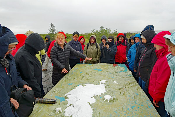 Als wir an dem Thingvellir-See (Pingvallavatn) ankommen, wo der Zugang zu der Spalte ist, die die amerikanische von der eurasischen Kontinentalplatte trennt, sieht der Himmel nicht sehr freundlich aus.Wir hören uns noch von unserer kompetenten Reiseleiterin Angelika die ausführlichen Erklärungen zu der Entstehung des Sees aus der letzten Eiszeit an. An einem Relief erklärt sie uns alles. Mit ihr sind wir im Übrigen sehr zufrieden und sind froh, dass wir für die gesamte Reise nur eine einzige Reiseleiterin haben. Sie ist mit einem Isländer verheiratet und wohnt seit 15 Jahren in Reykjavik. Manche Eigenheiten der Isländer erklärt sie sehr humorvoll und hat viele Anekdoten parat. Und zwischendurch erzählt sie natürlich auch viel von den isländischen Sagen.