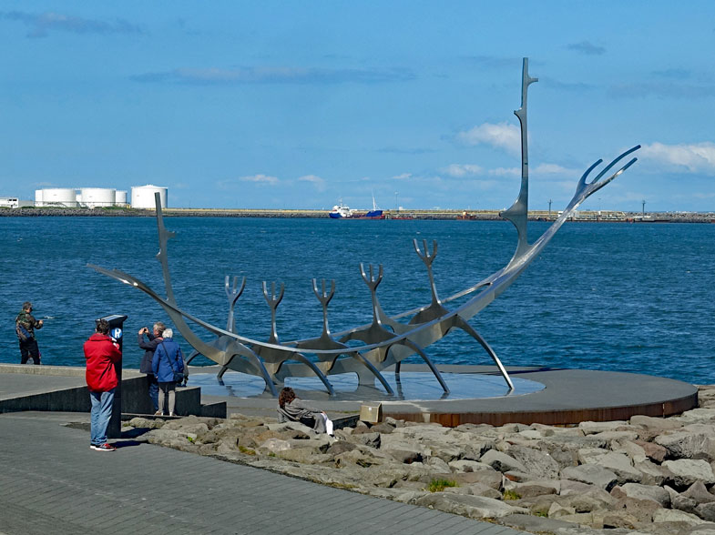 Aber der Bus hält freundlicherweise auf halber Strecke, als wir winken und lässt uns einsteigen. So machen wir zuerst einmal eine komplette Rundfahrt und hören uns im Audioführer in deutscher Sprache die Erklärungen zu den einzelnen Sehenswürdigkeiten an. Wir haben Glück mit dem Wetter: Es ist blauer Himmel und wir sitzen oben auf dem offenen Bus windgeschützt in der ersten Reihe hinter der Scheibe und können nicht nur wunderbar alles sehen, sondern auch schöne Fotos machen. Das erste ist das stilisierte Wikingerschiff, das der isländische Künstler Jon Gunnar Arnason geschaffen hat. Die Skulptur aus Edelstahl hat den Namen "Sonnenfahrt" und leuchtet je nach Sonneneinstrahlung in unterschiedlichen Farben.