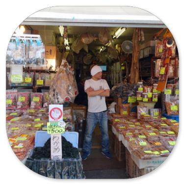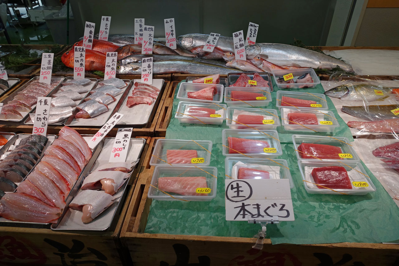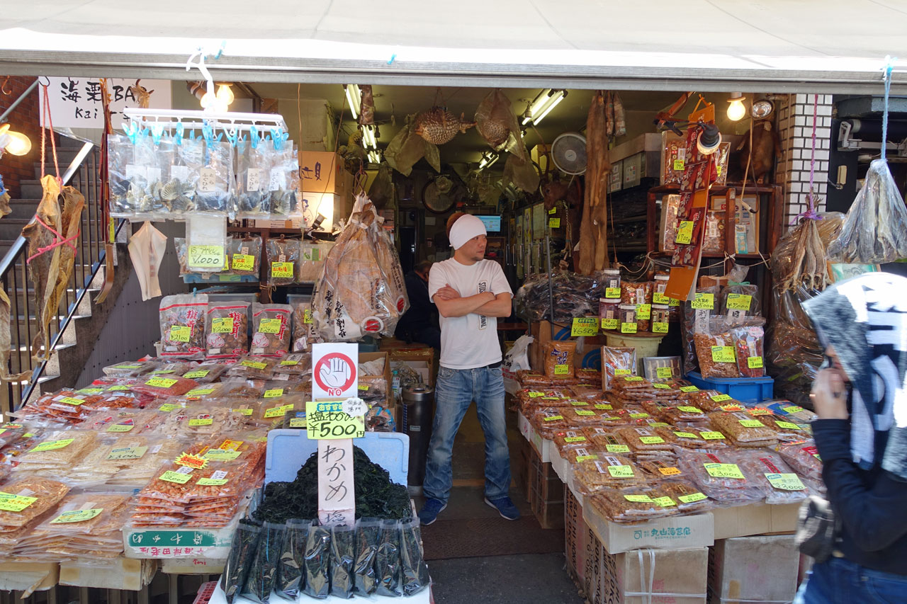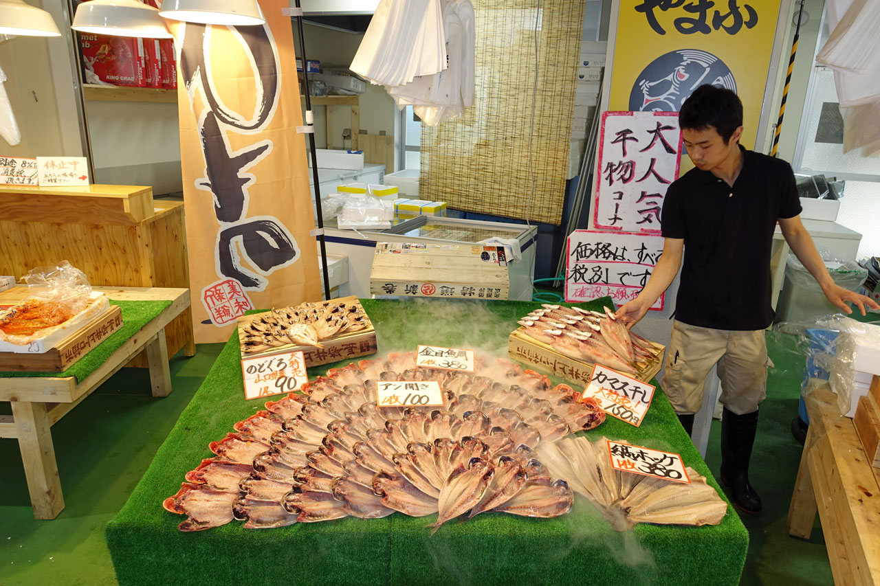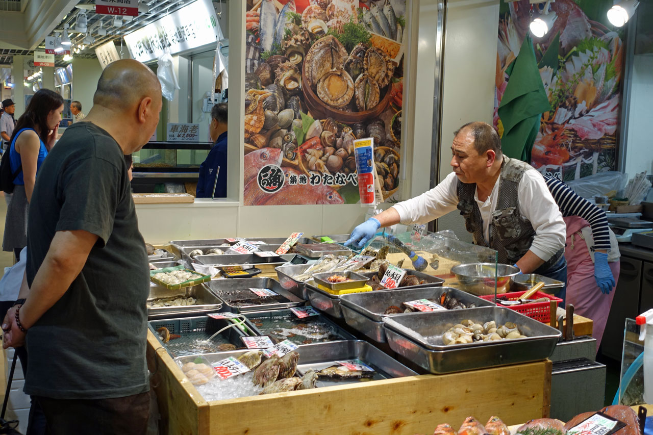Zwischen den Läden und Verkaufsständen gibt es unheimlich viele Restaurants. Meist befindet sich vorn ein Verkaufsstand, an dem die Kunden die Fische aussuchen. Dann werden die für sie zubereitet und hinten im Restaurant an Tischen serviert. Alle Restaurants sind bereits zu dieser Zeit am Morgen gut besucht, weil die Japaner viel Fisch zum Frühstück essen. Wir schlendern durch die engen Gassen und wundern uns, dass es weder nach Fisch riecht noch stinkt. Nicht wie in Thailand oder in China.