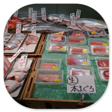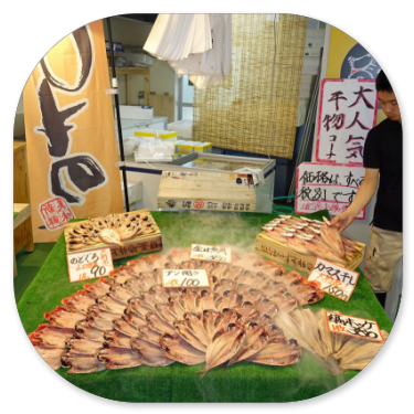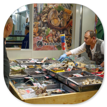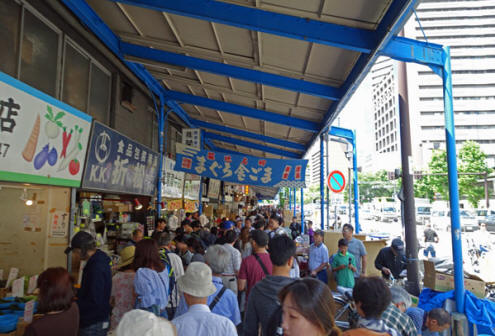 Im Reiseführer haben wir gelesen, dass Besucher nur bis 9 Uhr eingelassen werden, aber für die Versteigerungen ist es jetzt sowieso zu spät, da es schon halb elf ist. Um die Versteigerung richtig zu sehen, hätte man aber schon um 6 Uhr morgens kommen müssen. Jetzt haben auch die meisten Hausfrauen bereits an den Fischgeschäften bereits eingekauft und der innere Markt ist geschlossen. Es ist nur der äußere Markt zugänglich, der aber ein Anziehungspunkt für sämtliche Touristen ist, denn hier gibt es alles, was sich japanische Feinschmecker für ihre Küche wünschen. Es wird hier nicht nur Fisch, Obst und Gemüse angeboten, sondern alles, was rundum für die Küche erforderlich ist: Messer, Töpfe, Schalen, Gewürze, Geschirr und andere Artikel. An den Verkaufsständen ist unheimlich viel Betrieb. Alles ist supersauber und wird eisgekühlt oder direkt auf Eis serviert. Die meisten Nahrungsmittel werden sofort mundgerecht geschnitten und auf Schalen mit Beilagen und Saucen zum direkten Verzehr angeboten. Da die Japaner mit Stäbchen essen, müssen die Stücke auch entsprechend klein sein. Die Auswahl an Fischen, Muscheln und anderem Seegetier ist unermesslich. Die Preise sind allerdings unerhört: Ein Kilo Thunfisch kostet umgerechnet zwischen 48 und 60 Euro, ein Bund mit 3 Stangen Spargel 4 Euro und eine Melone zwischen 8 und 16 Euro. Hier einige Eindrücke vom Fischmarkt: