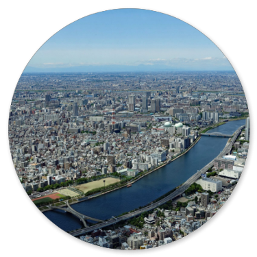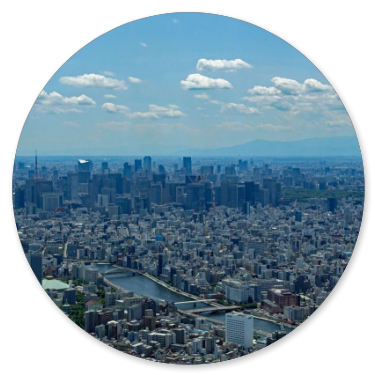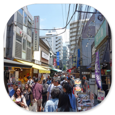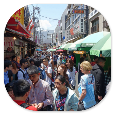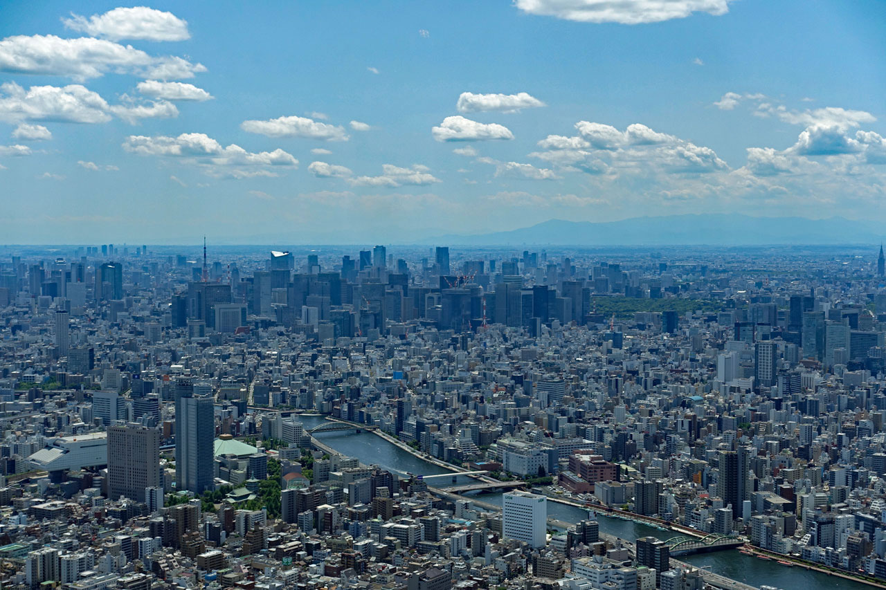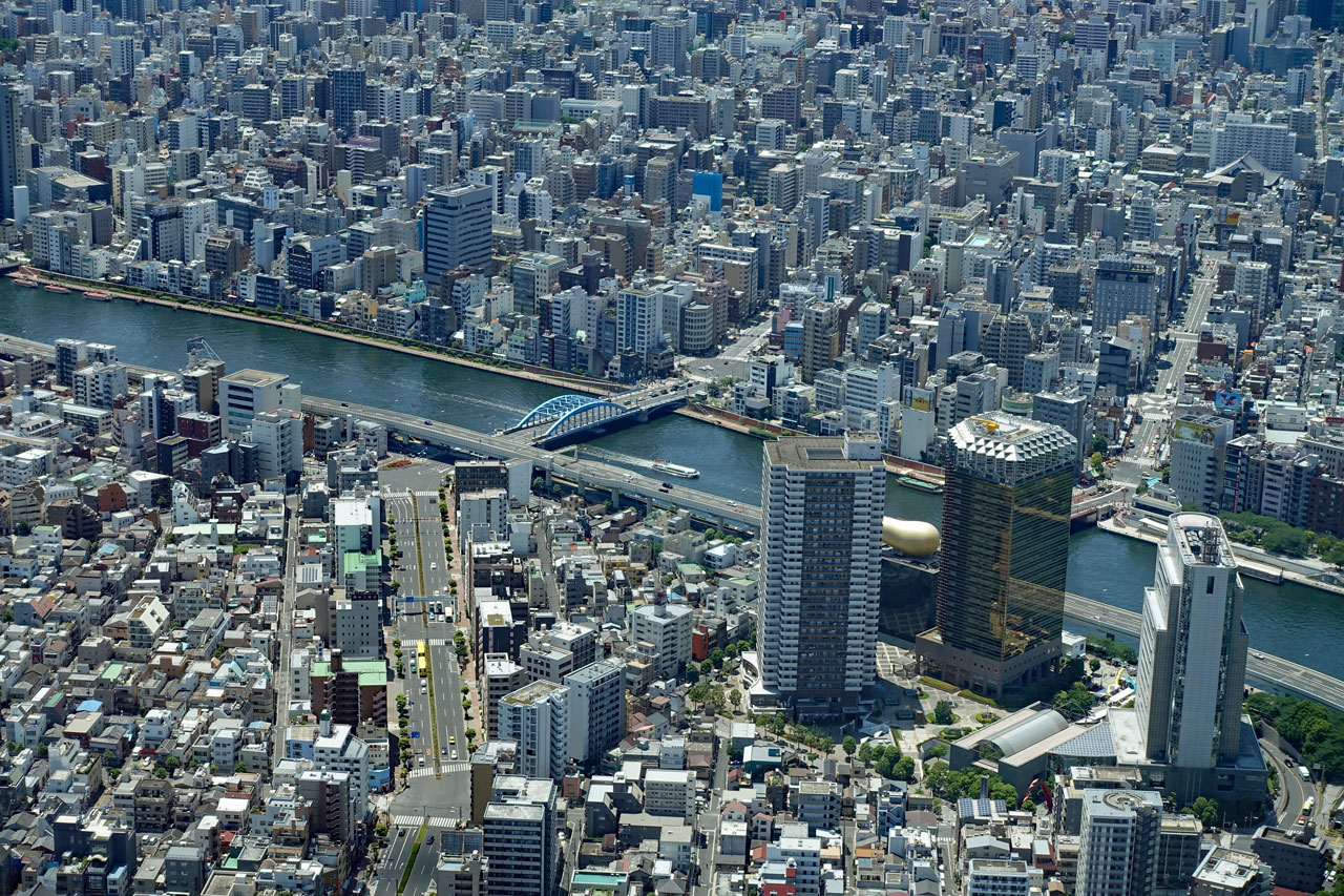 Als wir schließlich am Endpunkt und damit wieder an unserem Einsteiegpunkt angelangt sind, steigen wir aus und genehmigen uns erst einmal eine Pause mit einem Cappuccino. Der schlägt mit 8 € zu Buche. Immerhin noch etwas billiger als auf dem San Marco Platz in Venedig, wo wir 12 € bezahlt haben. Anschließend steigen wir in einen Bus der blauen Linie zum Tokyo Skytree. Die Tour ist interessanter von den Fotomotiven her und führt durch Stadtteile mit vielen Menschen. In Ueno ist zum Beispiel viel los und am Skytree natürlich auch.