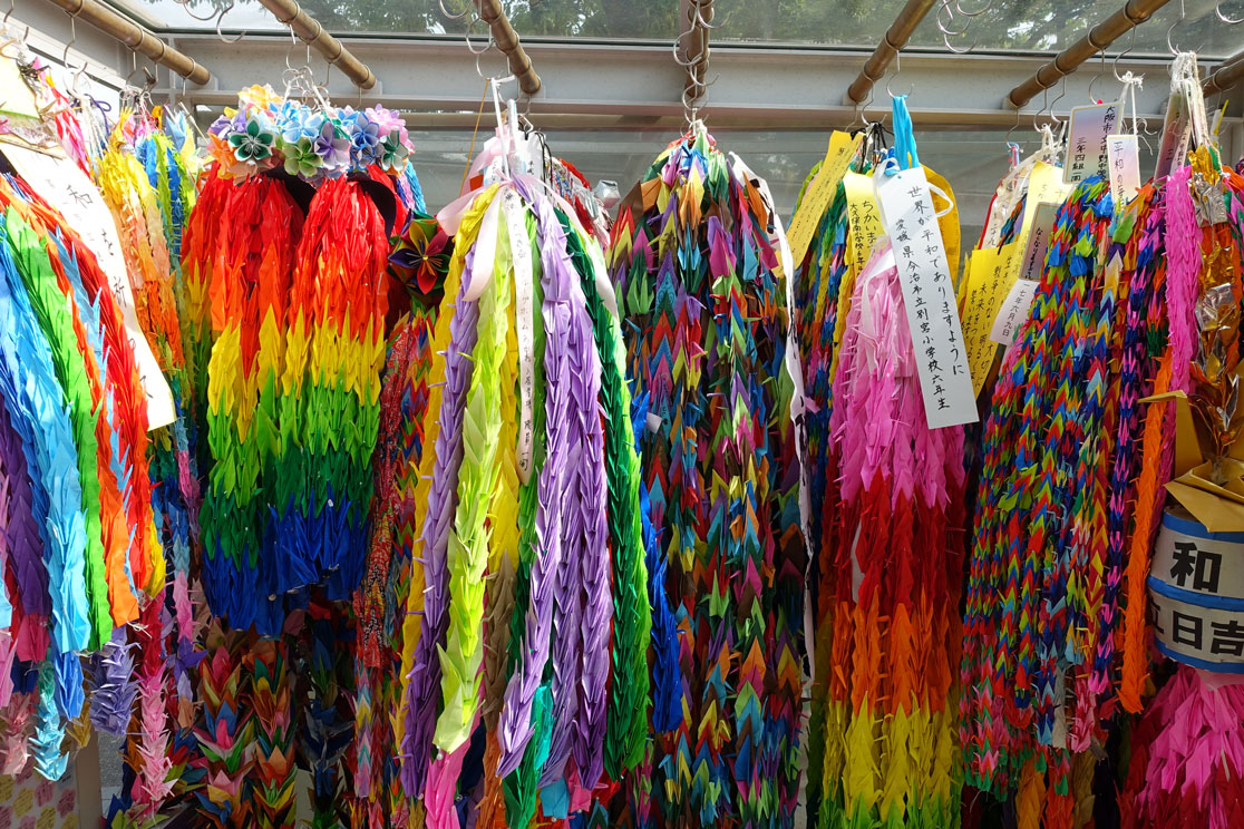 Gegen 14:15 Uhr sind wir im Zentrum von Hiroshima und besichtigen den Friedenspark. Der ist sehr beeindruckend. Vor allem das Museum ist sehr informativ, das wir zuerst besuchen. Viele Dokumente mit eindringlichen Fotos, Zeitzeugenaussagen und Videos zu dem Atombombenabwurf im August 1945 sind dort zu sehen und zeigen die Botschaft des japanischen Staates, dass man sich wünscht, dass so etwas nie wieder passieren darf. Wir spazieren durch die abgedunkelten Räume und schauen uns die beklemmenden Bilder an. Manche Darstellungen sind grauenhaft und es sind auch Gegenstände ausgestellt, die man anfassen darf, so die Limonadenflasche, die durch die Hitzewelle so verformt wurde, dass das Glas fast geschmolzen wäre. Da kann man sich vorstellen, was mit den Menschen passiert ist, die davon erfasst wurden.
