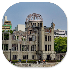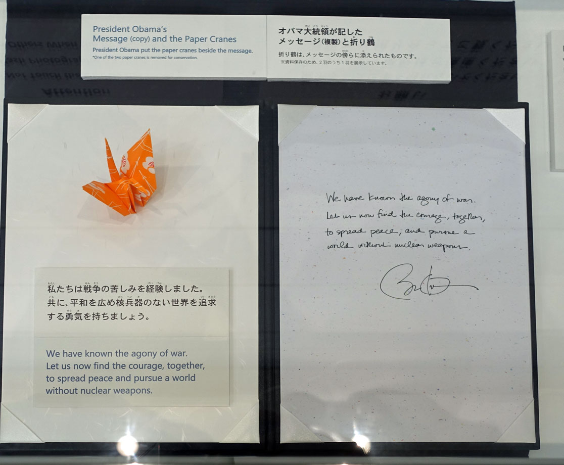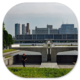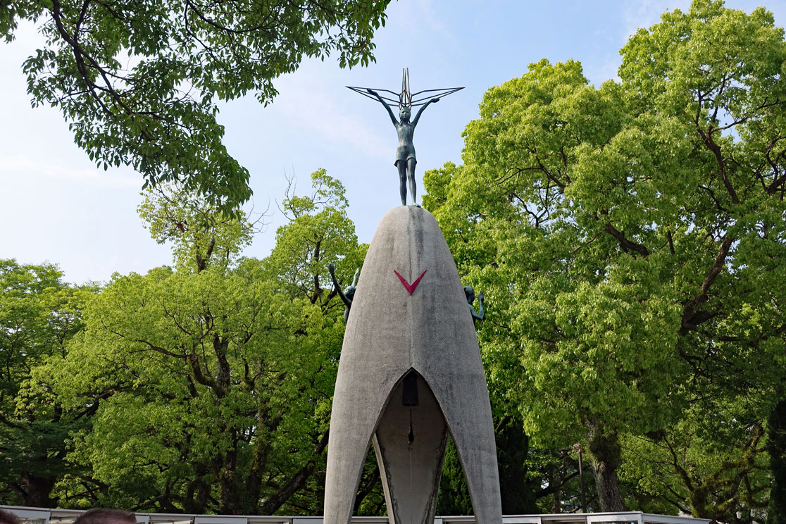 Gegen 14:15 Uhr sind wir im Zentrum von Hiroshima und besichtigen den Friedenspark. Der ist sehr beeindruckend. Vor allem das Museum ist sehr informativ, das wir zuerst besuchen. Viele Dokumente mit eindringlichen Fotos, Zeitzeugenaussagen und Videos zu dem Atombombenabwurf im August 1945 sind dort zu sehen und zeigen die Botschaft des japanischen Staates, dass man sich wünscht, dass so etwas nie wieder passieren darf. Wir spazieren durch die abgedunkelten Räume und schauen uns die beklemmenden Bilder an. Manche Darstellungen sind grauenhaft und es sind auch Gegenstände ausgestellt, die man anfassen darf, so die Limonadenflasche, die durch die Hitzewelle so verformt wurde, dass das Glas fast geschmolzen wäre. Da kann man sich vorstellen, was mit den Menschen passiert ist, die davon erfasst wurden.Mir hat auch die Botschaft von Präsident Obama gefallen, der 2016 Hiroshima besucht hat und dazu geschrieben hat: