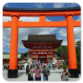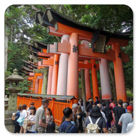 Obwohl wir für heute eigentlich schon genug Schreine gesehen haben, kündigt Shin-itchi für den Nachmittag noch einen weiteren Besuch in einem Schrein an. Aber immerhin machen wir erst einmal Mittagspause am Bahnhof von Kyoto. Den kennen wir schon von unserem ersten Besuch und begeben uns deshalb auf die Suche nach einem gemütlichen Café. Aber damit sieht es schlecht aus hier in Kyoto - wie übrigens überall in Japan - , sodass wir wir uns bei Starbucks mit einem Cappuccino und einem Stück Käsekuchen zufrieden geben müssen. Immerhin reicht es anschließend noch zu einem Eis bei "Baskin Roberts", das wir von Amerika kennen. Pünktlich um 14:15 Uhr sind wir wieder am Treffpunkt und fahren zum Fushimi-Inari-Schrein, dem Schrein mit den 10 000 Toren.