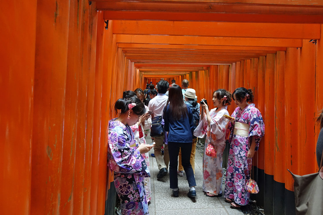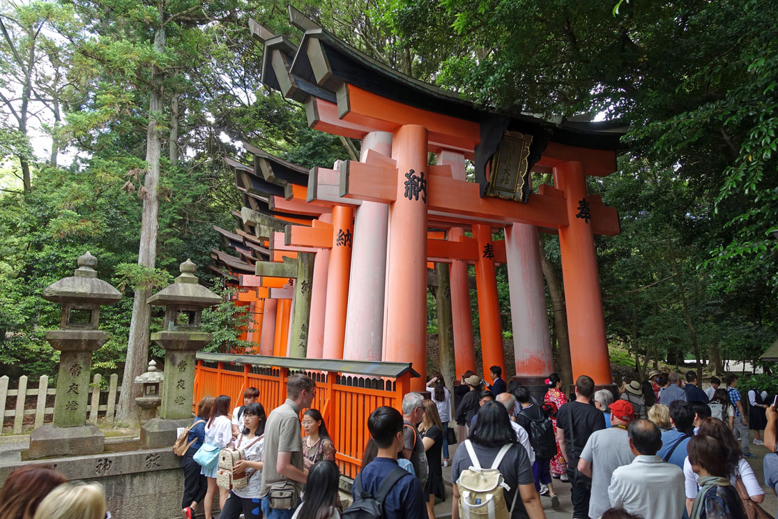 Millionen von Japanern besuchen in den ersten Neujahrswochen diesen Schrein und bitten um Glück, Erfolg und langes Leben. Die Spendenquote ist die zweithöchste in Japan nach dem Meiji-Schrein in Tokio. Auch wir befinden uns innerhalb einer großen Menschenmenge und sind froh, einmal einen Abschnitt ohne Touristen für ein Foto zu finden. Aber interessant ist die Anlage schon. und wir verstehen, warum so viele Leute durch die Tunnelgänge wandern.