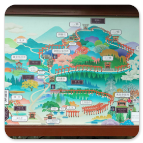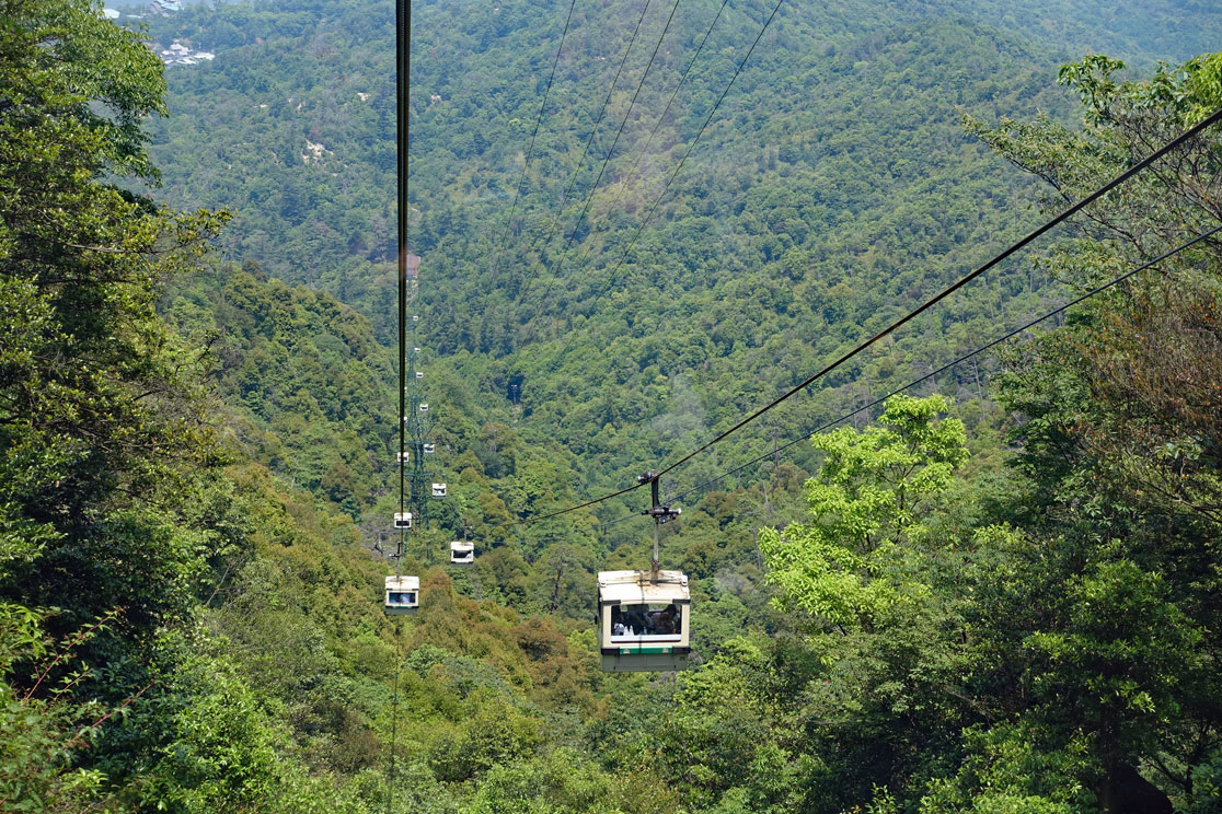 Sehr ausführlich erklärt uns unser Reiseführer den Schrein und die Bedeutung der Figuren. Auf der Insel gibt es viele Wanderwege, deshalb ziehen wir jetzt los zur Seilbahn und fahren mit ihr auf die oberste Plattform. Unterwegs müssen wir noch in eine andere Gondel umsteigen. Von oben hat man einen hervorragenden Blick auf die umliegenden kleinen Inseln, aber leider ist es ziemlich diesig an diesem Vormittag, sodass die Fotos nicht optimal sind.