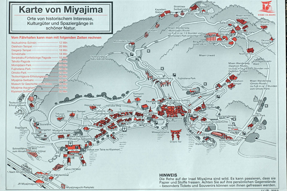 Wir haben drei Stunden Zeit, uns auf der Insel umzuschauen. Shin-itchi klärt uns über die zahmen japanischen Hirsche auf, die uns sehr klein erscheinen, beschreibt die einzelnen Sehenswürdigkeiten und verteilt ein deutsches Info-Blatt. Das gefällt uns sehr, denn so können wir uns gut orientieren. Hier eine kleine Diaschau mit unseren Beobachtungen: