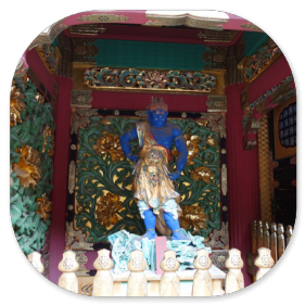Das ist ein komischer Tempel, denn schon sein Name ist seltsam, weil er "33-Säulen-Abstände" bedeutet. Im Tempel selbst darf man nicht fotografieren. Unser Reiseführer Shin-itchi erzählt viel von den buddhistischen und hinduistischen Göttern, als wir in der 120m langen Halle an 1000 Buddha- Figuren und 30 Göttern vorbei spazieren.Jedes Jahr findet hier am 15. Januar das Toshiya-Fest statt. Wichtigster Bestandteil dieses Festes ist ein Wettkampf im Bogenschießen, wobei die Bogenschützen durch die 120 m lange Halle schießen.