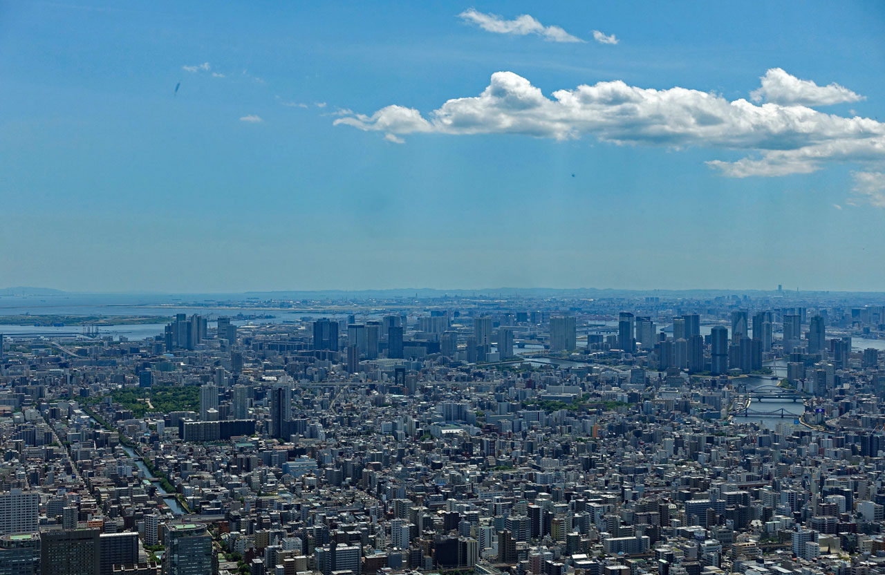 Am Tower angekommen, finden wir das Ticket-Center im 4. Stock und stellen uns in die Priority Line for International Visitors. Das ist ein sehr gutes Angebot der Japaner , denn so kommen wir viel schneller an die Reihe und erwerben für 3000 Yen ein Ticket für die Plattform auf 350m Höhe. Die nächste Plattform auf 450m Höhe kostet 1000 Yen mehr, lohnt sich aber nicht zum Fotografieren, weil es in der Ferne zu dunstig ist. An klaren Tagen im Winter oder Frühjahr kann man den Fujiyama von oben sehen, heute aber nicht, berichtet uns ein Holländer, der schon oben war. Für internationale Besucher gibt es auch einen gesonderten Fahrstuhl, was uns sehr entgegen kommt, denn es steht schon eine ziemlich große Menschenmenge vor den Fahrstühlen.