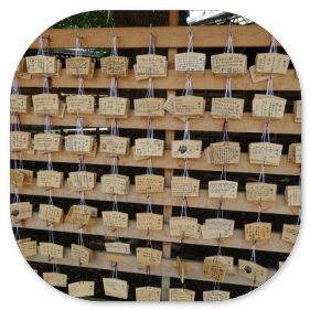 Der Kasuga-Taischa-Schrein wird auch der Schrein der 10 000 Laternen genannt. In Wirklichkeit sind es aber nur 3000. Er ist uralt und wurde bereits im Jahre 768 erbaut. Die Wege zu dem Schreine sind mit uralten Steinsäulen - wie auf dem rechten Bild - gesäumt. Daneben gibt es noch viele Laternen aus Bronze oder anderen Metallen. Auf vielen sind die typischen Wunschtäfelchen angebracht. Zweimal im Jahr werden alle Laternen angezündet und leuchten dann wunderschön am Abend. Das ist am 3. Februar und 14./15. August beim Mantoro Fest der Fall. Eigentlich soll es an die Zeit erinnern, als es noch keine elektrische Beleuchtung gab. Der Zeitpunkt des 3. Februar ist nämlich nach dem alten Mondkalender der Japaner der Beginn des Frühlings. Wir schauen in die Laternen hinein und finden in ihnen Wunschtäfelchen oder Papierblätter mit verschiedenen Wünschen. Nach dem Glauben der Shintoisten gehen nämlich die Wünscheam Tage des Lichterfestes in Erfüllung.