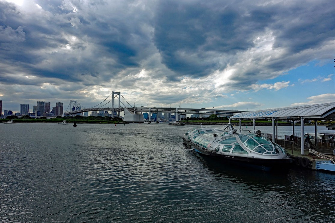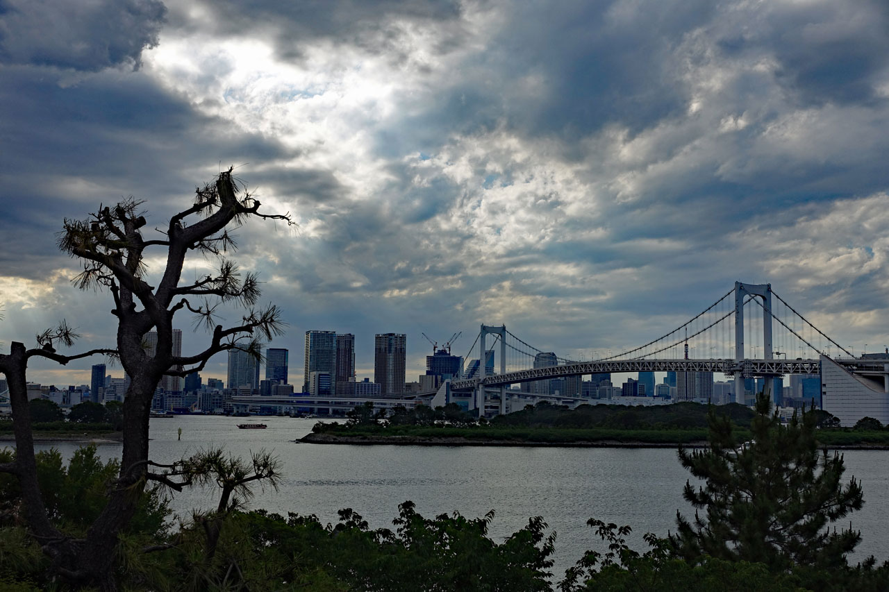 Die Sonne scheint nur noch vereinzelt durch die sich langsam zuziehenden Wolken, als wir um 16:00 Uhr in Odaiba anlegen, aber der Blick auf die Rainbow Bridge ist doch sehr malerisch:
