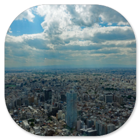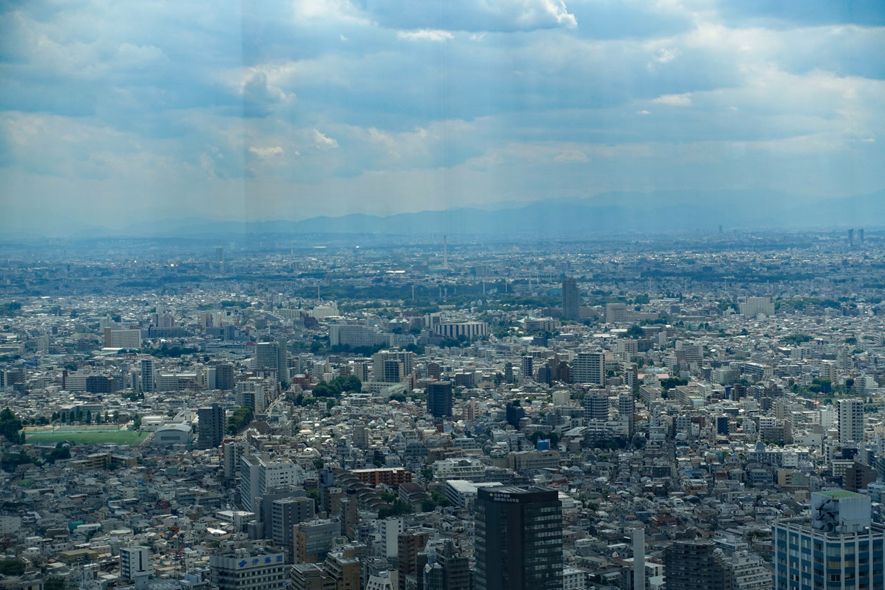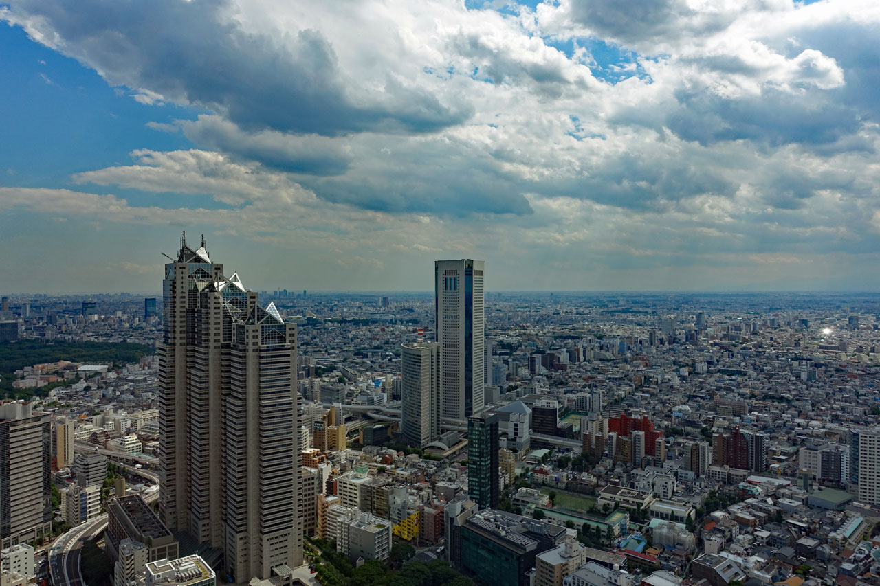 Durch einen Tunnel gelangt man in das 243 m hohe Rathaus von Tokio, das ebenfalls einen gewaltigen Verwaltungskomplex darstellt. Dort kann man kostenlos in die 43. Etage hinauffahren, wo man einen fast 360° Rundblick über die Stadt hat. Leider kann man nur durch die Fenster fotografieren. Hier einige Fotos davon: