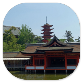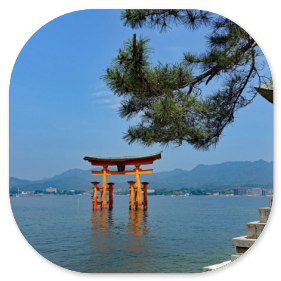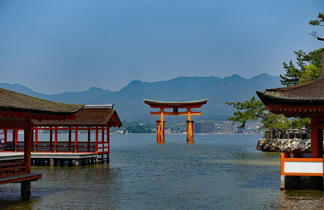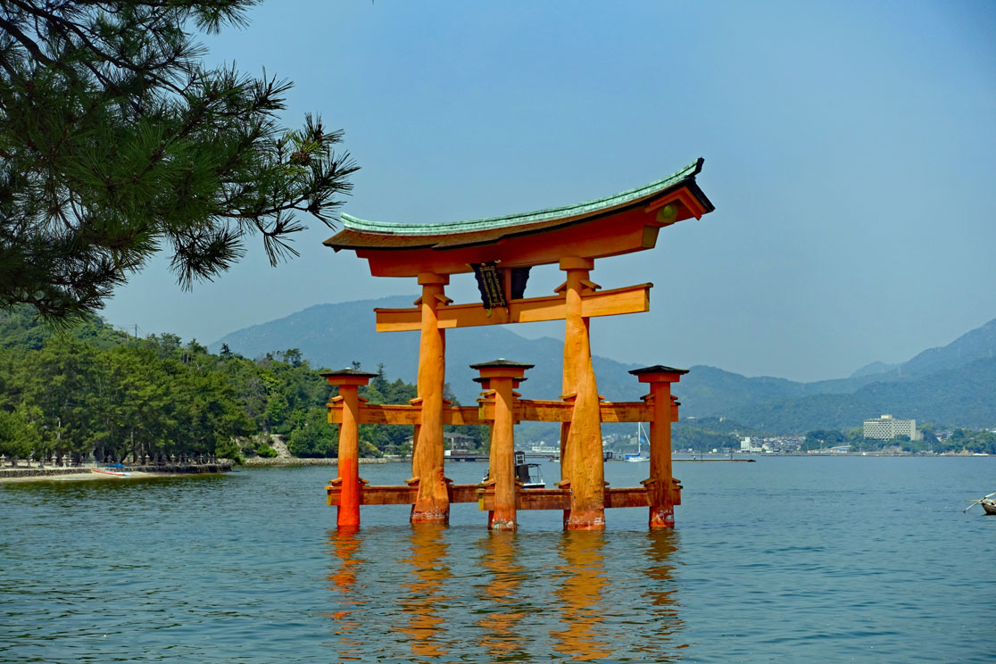 Mit dem Bus sind wir in 20 Minuten an der Anlegestelle der Fähre, die hinüber zu der heiligen Insel führt. Die Insel mit dem Itsukushima-Schrein gehört zu den bedeutendsten Sehenswürdigkeiten Japans. "Itsukushima" heißt auf Deutsch "Tabu-Insel" und das bedeutet, dass auf der Insel keine Bäume gefällt und keine Tiere erlegt werden dürfen. Es gibt auf der Insel sogar noch Berg-Urwald und die kleinen japanischen Hirsche laufen frei herum. Für viele Japaner ist Miyajima ein bevorzugtes Ausflugsziel.
