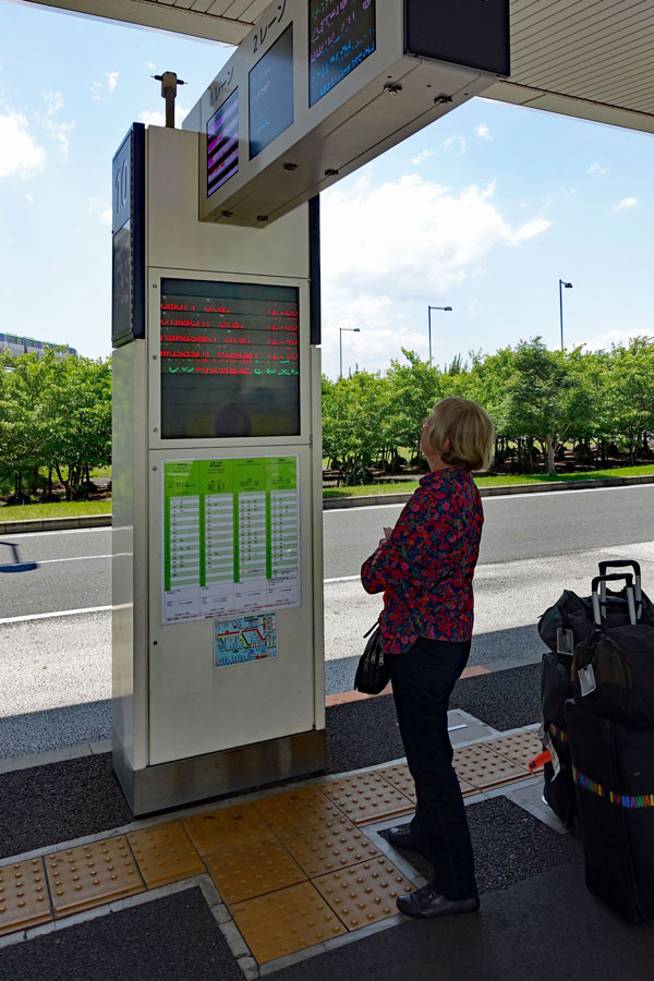 Diese vier Sprachen fanden wir im Übrigen sehr oft bei wichtigen Ankündigungen. Ansonsten war in den Städten nur eine englische Übersetzung vorhanden, auf dem Land aber oft keine andere. Da musste dann die Zeichensprache helfen. Aber jetzt zurück zu unserer Ankunft im Flughafen Haneda in Tokyo. Den Bahnsteig Nr. 10 finden wir schnell, als wir aus dem Terminal heraus kommen. Wir sind zunächst sehr froh und erleichtert, dass die Japaner die arabischen Ziffern übernommen haben. So können wir uns wenigstens an den Zahlen orientieren. Die elektronische Anzeige macht uns schon einiges Kopfzerbrechen, weil sie nur aus japanischen Schriftzeichen besteht. Aber dann erinnern wir uns daran, dass die Abfahrtszeit ja 12:35 Uhr ist und wir auf dem richtigen Haltepunkt Nr. 10 stehen. Nur ein einziger Bus mit der Abfahrtszeit 12:35 Uhr ist aufgeführt.