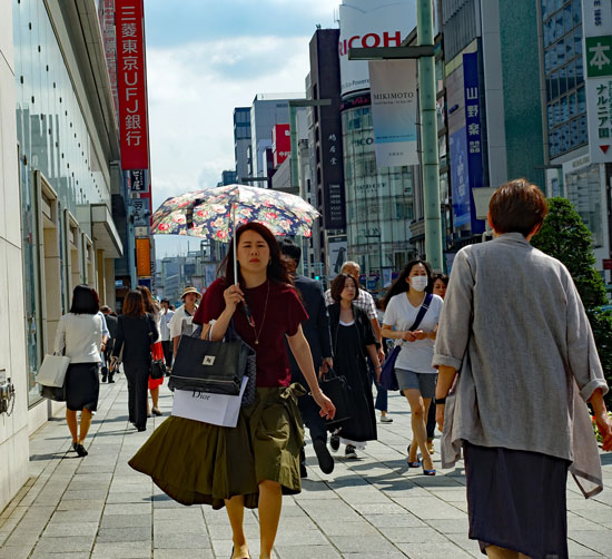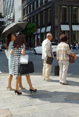 Uns fällt im Übrigen auf, dass die Japaner gar nicht so sehr die farbige Kleidung lieben, sondern dass fast alle irgendwie schwarz-weiß gekleidet sind. Farbige T-Shirts , Hemden oder Jaketts sieht man selten. Auch lässige Kleidung ist verpönt. Vielleicht sind alle, die hier so hektisch die Kreuzung überqueren, Angestellte, die Wert auf korrekte Kleidung legen. Das weiß man natürlich nicht, aber die Touristen kann man ganz gut von den Geschäftsleuten und Angestellten unterscheiden.