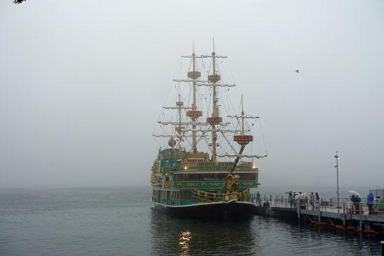 Wir versuchen wie alle Besucher den Fujiyama hinter der Bergkette im Wolkendunst zu erspähen, aber es gelingt uns nicht, obwohl auf der Aussichtsplattform eine Hinweistafel angebracht ist, wo er zu lokalisieren ist.