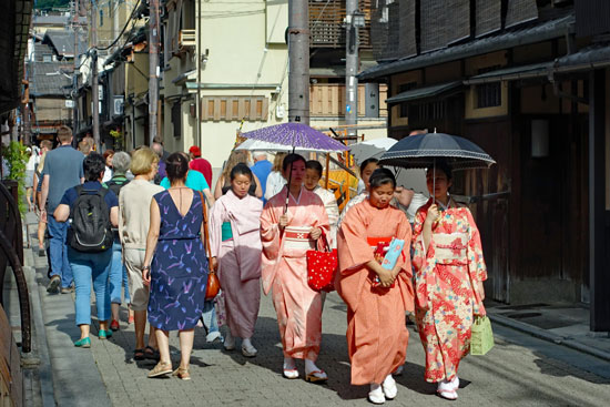 Um 15:10 Uhr fahren wir weiter zum Gijon-Distrikt und in die Altstadt von Kyoto, wo viele japanische Restaurants sind und Geikos und Maikos zu finden sind. Wir hoffen natürlich, eine Geisha zu sehen und fotografieren zu können. Wir werden von unserem Reiseführer darüber aufgeklärt, dass die schön gekleideten Kimono-Passanten gar keine Japanerinnen sind, sondern Touristinnen aus China oder Korea, die sich einen Kimono für einen Tag geliehen haben und damit durch die Stadt spazieren. Ihre wichtigste Aufgabe besteht darin, vor bestimmten Gebäuden mit dem Smartphone Selfies zu schießen und diese per Whatsapp nach Hause zu schicken. Auf dem linken Bild sieht man also deutlich den Unterschied zwischen europäischen Touristinnen auf der linken Seite und asiatischen Touristinnen auf der rechten Seite.