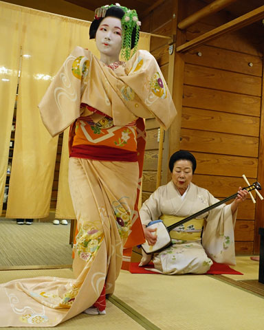 Nach dem Essen werden die Vorhänge zugezogen, sodass wir vor den anderen Gästen des Restaurants abgeschirmt sind. Dann erscheint die Geisha mit ihrer Schülerin, der Maiko. Diese führt zwei klassische Tänze zur Musik ihrer Lehrerin vor, die sie auf dem "shamisen" begleitet, dem dreisaitigen Instrument aus Okinawa. In meinen Ohren klingt alles sehr gewöhnungsbedürftig und einschläfernd. Die Bewegungen der Maiko sind dabei streng vorgegeben und sehr langsam.