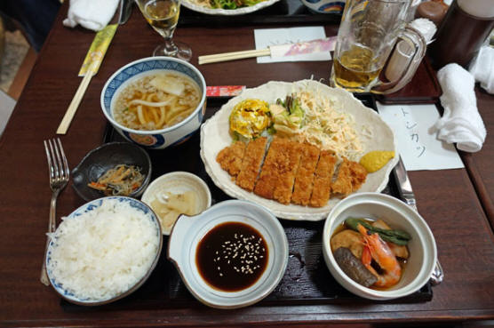 Das Schnitzel wird - wie so oft in Japan - als "Set" serviert. Es ist also eine Vorspeise dabei, eine Suppe, eingelegte Gemüse als Spezialitäten von Kyoto und natürlich Reis mit Sojasoße und Sesamkernen. Das Schnitzel ist bereits klein geschnitten, damit man es mit Stäbchen essen kann, aber wir bestellen uns Besteck dazu. Alles ist sehr lecker, sowohl der Krautsalat auf dem Teller wie auch das gebackene Kürbispüree. Und der Senf darf natürlich nicht fehlen. Im Endeffekt ist es auch gar nicht so teuer, denn wir bezahlen 2200 Yen dafür, das sind umgerechnet 17,60 €. Das kleine Bier ( 250 ml) kostet 380 Yen, das große Bier (400 ml) 500 Yen, das entspricht 3,05 € bzw. 4€. Wenn man bedenkt, dass man in Japan kein Trinkgeld bezahlt, ist das nicht übermäßig teuer.