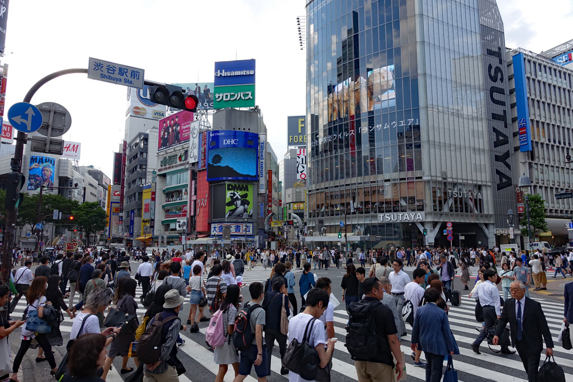 In einem Bahnhof, in dem täglich zigtausende Menschen auf verschiedenen Ebenen ein- und aussteigen, ist es natürlich nicht einfach, den richtigen Bahnsteig zu finden. So fahren auch wir erst einmal einige Rolltreppen hinauf und hinunter, um den richtigen Bahnsteig für den Zug nach Shibuya zu finden. Nach erneuter Sucherei nach dem richtigen Bahnsteig im Bahnhof gelangen wir mit Umsteigen nach einer halben Stunde in den eigentlich gar nicht so weit entfernten Stadtteil Shibuya, der einen ähnlich großen Bahnhof mit so vielen Fahrgästen hat wie Shinjuku. Als wir aus dem Bahnhof herauskommen, stehen wir direkt auf der berühmten Kreuzung Shibuya Station. Viele Touristen fotografieren die Bronzestatue und das Wandbild des treuen Hundes Hachiko. Die Geschichte des Hundes Hachiko können Sie im Internet nachlesen. Sie ist rührend und ein Symbol der Japaner für Treue geworden.Wesentlich interessanter ist aber der Blick über eine der verkehrsreichsten Kreuzungen der Welt. An der Shibuya Station Kreuzung überqueren während der grünen Ampelphase von 90 Sekunden in der Regel mehrere Tausend Menschen die Zebrastreifen, die längs und quer über die Straße gemalt sind. Zu Spitzenzeiten sollen es mehr als 15000 sein.