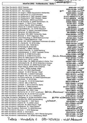Das war Mitte Januar 2003. Beflügelt von dem Fortschritt unserer Suchaktion bat ich Wolfgang, die Polizeisuchmaschine doch noch einmal zu aktivieren, um mir noch einmal bei der Suche nach Fritz Peter Wunderlich zu helfen, den ich trotz aller Bemühungen nicht auftreiben konnte. Wolfgang und ich hatten uns schon die Telefonanrufe geteilt, weil es 120 Adressen in Deutschland mit diesem Namen gab. Aber keine Chance: alle Wunderlichs hatten ihren Ursprung im Osten, aber keiner kam aus Pullach bei München, der irgendwie verwandt mit ihm gewesen sein könnte. Sogar alle Anfragen in der Flensburger Verkehrssünderkartei und bei der Bundesversicherungsanstalt für Angestellte in Berlin blieben ergebnislos. "Wer weiß, vielleicht spielt der schon Harfe", sagte der Polizist. Auch Axels Anfragen über die Einwohnermeldeämter blieben ohne Erfolg.