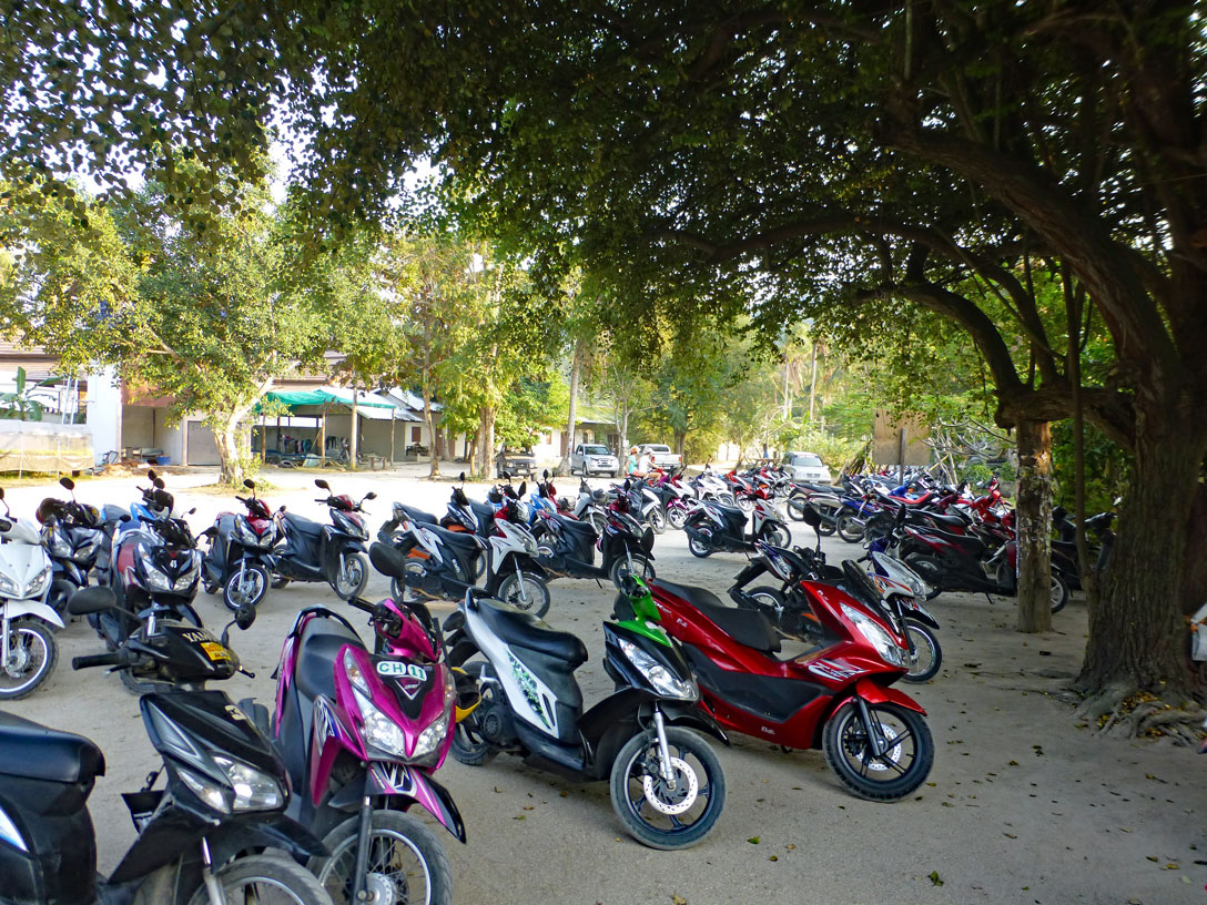 Anschließend fahren wir an der Küste weiter und kommen kurze Zeit später nach Mae Haad. Das ist der Strand, der so hoch gelobt wird wegen seiner reichhaltigen Unterwasserwelt und der traumhaften Sonnenuntergänge. Dass er gut besucht sein muss, merken wir schon an den vielen Motorrollern und Mopeds, die auf dem Parkplatz und am Straßenrand stehen.