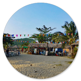 An dem sehr breiten Strand mit feinem Sand begrüßt uns ein lebhaftes, bunt geschmücktes Strandrestaurant; dazwischen gibt es Unmengen von Angeboten, die auf Tafeln angepriesen werden. An den ziemlich einfachen Bungalows, die auf dem hinteren Bereich des Strandes stehen, hängt viel Wäsche zum Trocknen. Man merkt, dass viele Backpacker hier wohnen und es sich am Strand gemütlich machen. Sonnenschirme, wie wir sie an unserem Hotelstrand gewöhnt sind, findet man überhaupt nicht. Hier einige Bilder von unserem Strandspaziergang: