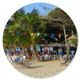 Die gesamte Strecke ist mit Ferienbungalows und Strandhütten belegt, dazwischen gibt es viele Restaurants.