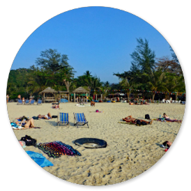 Der Sand am Strand ist wunderbar weiß und fein wie Puderzucker. Leider ist das Meer wegen der Ebbe sehr flach und auch nicht gerade sauber. Deshalb geht auch keiner ins Wasser und schwimmt dort, sondern alle sitzen nur am Ufer. Einige spielen Volleyball über ein primitiv aufgespanntes Netz zwischen zwei Bäumen, aber sonst ist nichts los. Es ist halt tatsächlich ein Strand für Rucksacktouristen.