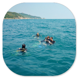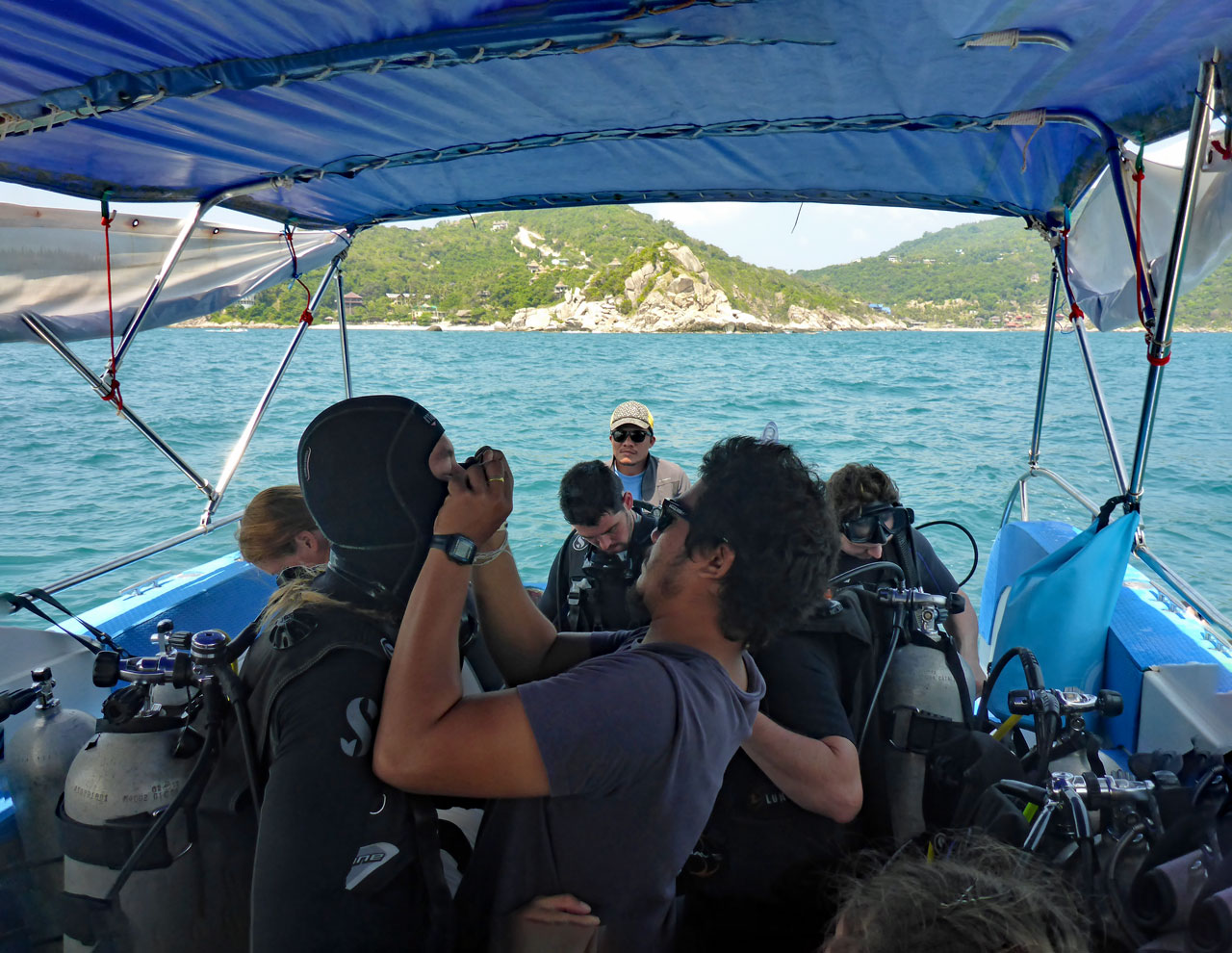 Die Sonne scheint noch nicht richtig durch die Wolken, aber das Meer ist ruhiger geworden. Ich habe für heute einen ganztägigen Ausflug nach Koh Tao mit dem Speedboot gebucht. Neben dem Anantara-Hotel unterhält die Firma H2O -Divers einen kleinen Stützpunkt, wo ich für 2500 BHT den Ausflug buche. Alice, eine der beiden Geschäftsführer erklärt mir am Vortag, dass sie wegen des Wetters und der Anmeldungen die Route geändert hätten und nicht zum Schnorcheln an den Strand von Koh Tao führen, sondern zum Tauchen nach Shark Island und zum Sail Rock. Beides seien auch hervorragende Plätze, um viele Fische zu sehen und die Chance zur Begegnung mit Riffhaien und Walhaien sei sehr groß. Als Schnorchler wäre ich gern auf dem Boot gesehen und würde sicher auf meine Kosten kommen.