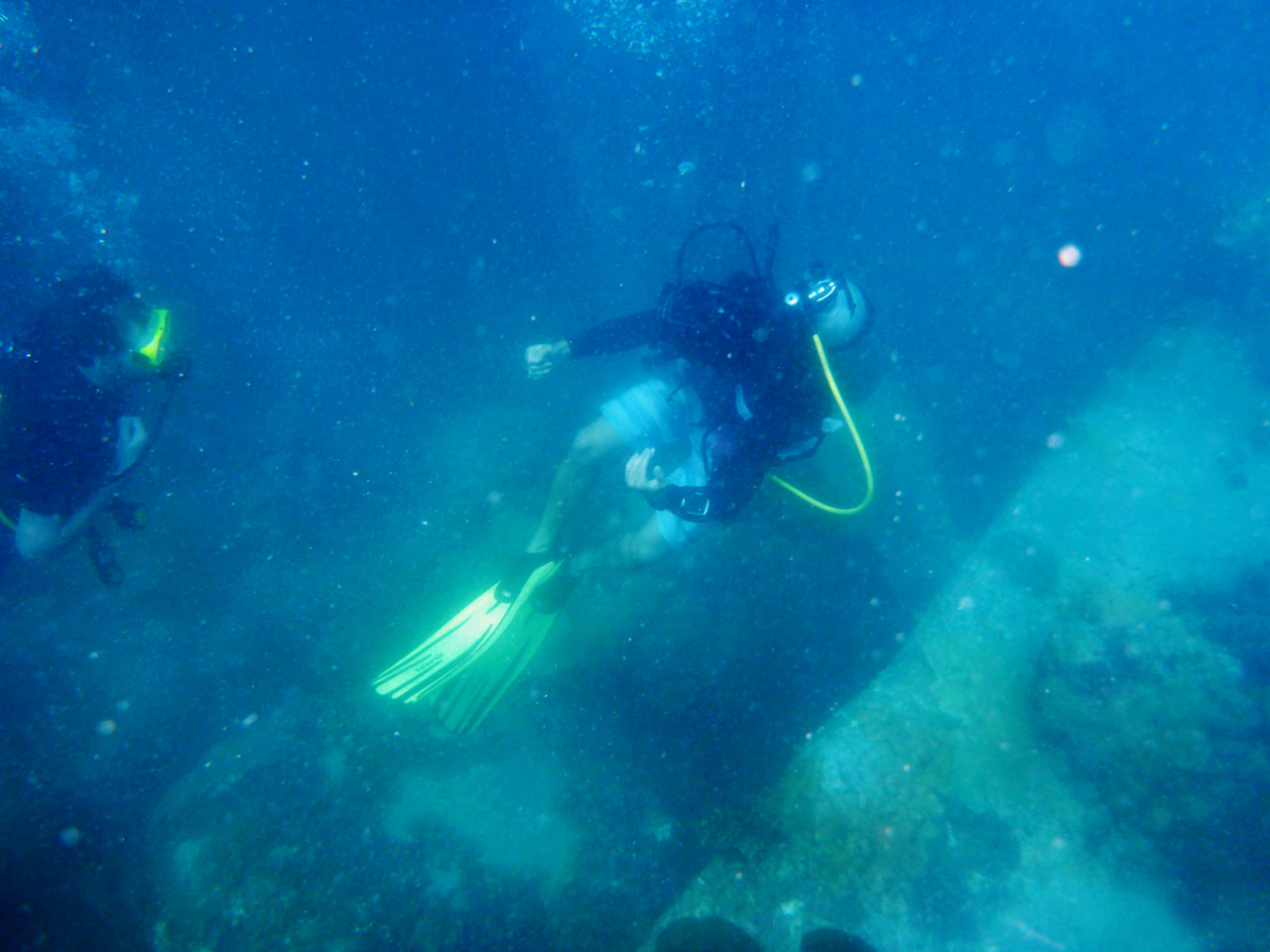Der Felsen ist 15 Meter hoch und das Meer rings herum ist 35 m tief. Auch hier sollen Walhaie, Riffhaie und große Grouper zu sehen sein. Die Taucher unseres Bootes verteilen sich auf zwei Vierergruppen und eine Frauengruppe. Martin macht alle darauf aufmerksam, dass sie eng beieinander bleiben sollen, da die Sicht evtl. noch schlechter als bei Shark Island ist. Die Attraktion an diesem Felsen ist, dass es unter Wasser einen Eingang zu einer Höhle gibt. Dieser liegt in etwa 18 Meter Tiefe. Man kann dann im Innern hochsteigen und in 12 Meter Tiefe durch eine andere Öffnung wieder heraus schwimmen. Einen zweiten und größeren Ausgang gibt es noch in etwa 6 Meter Tiefe.